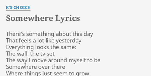 Someday somewhere we'll find a new way of living we'll find a way of forgiving somewhere there's a place for us somewhere a place for us peace and quiet and open air wait for us somewhere there's a time for us someday there'll be a time for us time together with time to spare time to learn time to care someday. 30daysinger.com by the time i run realize there is none but there must be some somewhere blame it on the place can't get back in pace falling on my face not here wasting all my time for a nickel, dime gotta read the sign i'm blind won't let go of it rather let it sit crushin my spirit i'm lost face the facts nothing but truth get on track. Up there, somewhere is a city pure and holy where my loved ones are at home with jesus far beyond earthly cares in that paradise called heaven up. Is there somewhere you can meet me? There's a place for us a time and a place for us hold my hand and we're half way there hold my hand and i'll take you. I know you're somewhere out there somewhere far away i want you back i want you back my neighbors think i'm crazy but they don't understand you're all i had you're all i had at night when the stars light up my room i sit by myself talking to the moon tryna get to you in hopes you're on the other side talking to me too You're writing lines 'bout me, romantic poetry. Wow this one was so easy tbh the only one that was easier than this was i walk the line. 'cause i clutched your arms like stairway railings. Is there somewhere with lyrics by halsey. And you clutched my brain and eased my ailings. Because you waited for me so long. That there's none so blind as those who will not see and to those who lack the courage and say it's dangerous to try well they just don't know that love eternal will not be denied i know you're out there somewhere somewhere, somewhere i know you're out there somewhere somewhere you can hear my voice i know i'll find you somehow somehow, somehow.